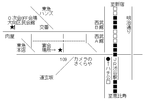 | JR渋谷駅ハチ公口より西武デパ―トを目指し、A館とB館の間を抜ける通り をずっと真っ直ぐ進みます。 |